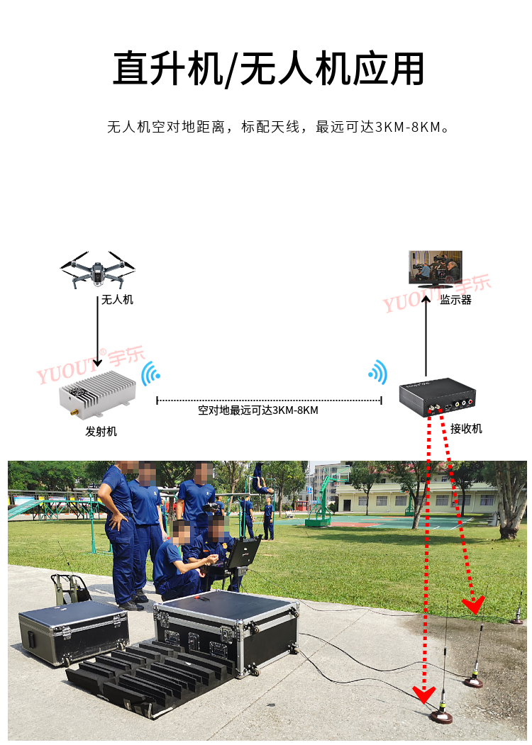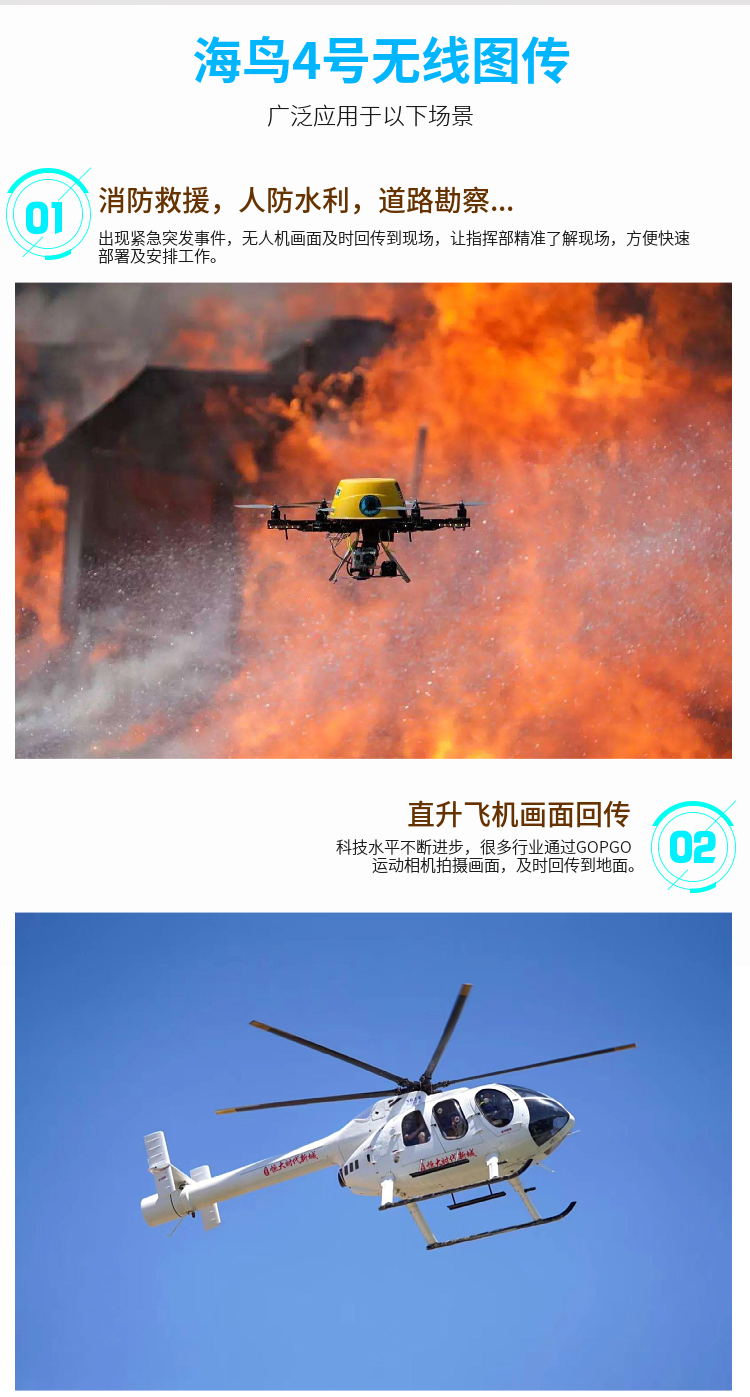 廣泛應用于軍事偵察、邊防巡邏、公安技偵、航拍、空中測繪、電力巡查、鐵路搶險、海事執法、城管執法、新聞密訪、衛生防疫等或突發事件應急指揮、無人車、無人船、特種機器人等領域。設備體積小可偽裝做密訪取證、空中作業圖傳、無人機無線圖像傳輸。
