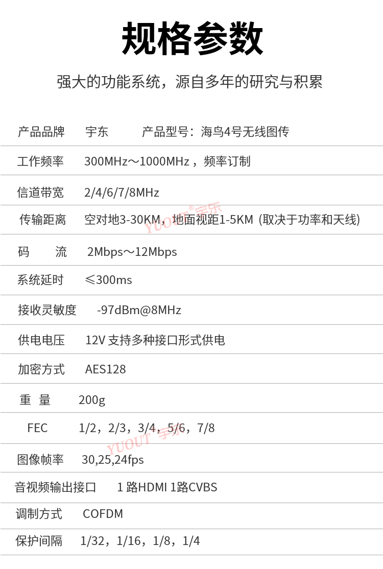 宇東海鳥4號無線圖傳高清微型無線視頻傳輸系統,采用Coded Orthogonal Frequency Division Multiplexing:編碼正交頻分復用調制技術,具有傳輸頻帶窄、很強的抗多徑干擾能力和抗多徑衰落能力,能夠實現非視距(NLOS),高速運動情況下實時傳輸高質量圖像。