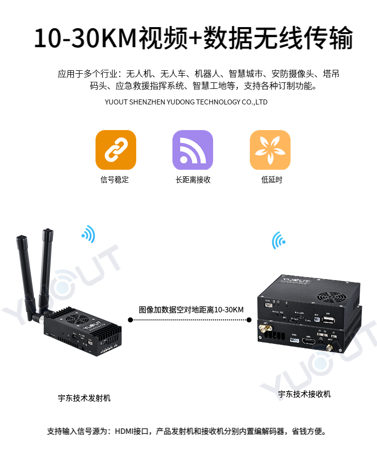 YD-HDT530-DM是應(yīng)用于無(wú)人機(jī)行業(yè)的圖數(shù)控一體化超遠(yuǎn)距離無(wú)線傳輸設(shè)備(最遠(yuǎn)可達(dá) 15至30 公里),具有體積小、功耗低、通信距離遠(yuǎn)等特點(diǎn),支持高清視頻、飛控?cái)?shù)據(jù)、云臺(tái)控制數(shù)據(jù)、遙控器控制數(shù)據(jù)等同時(shí)傳輸。