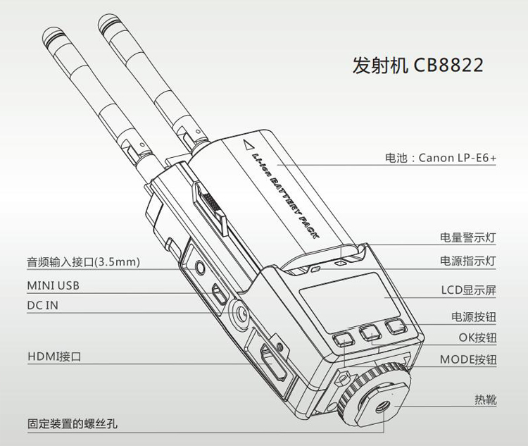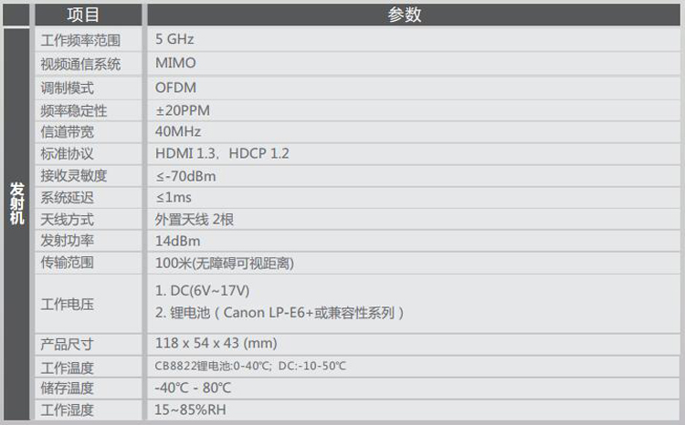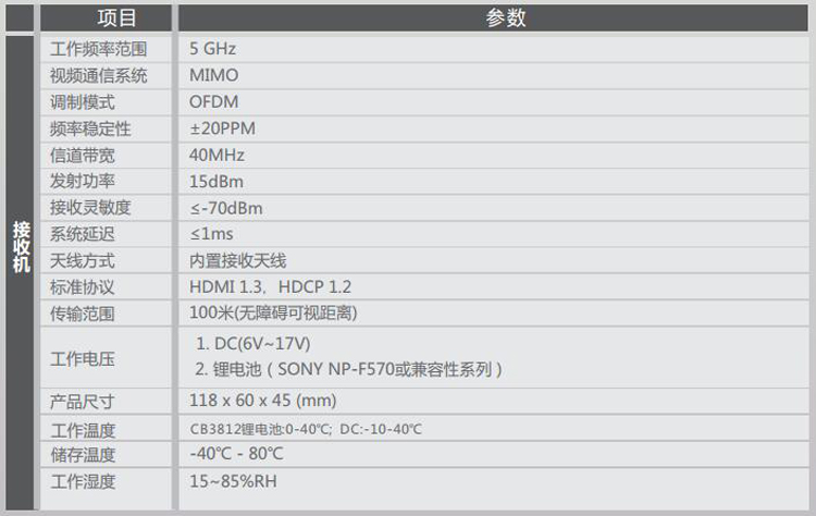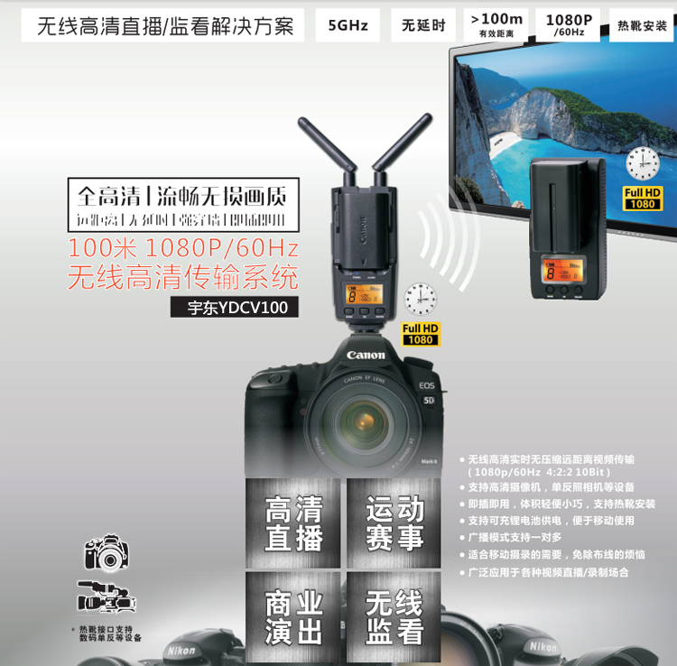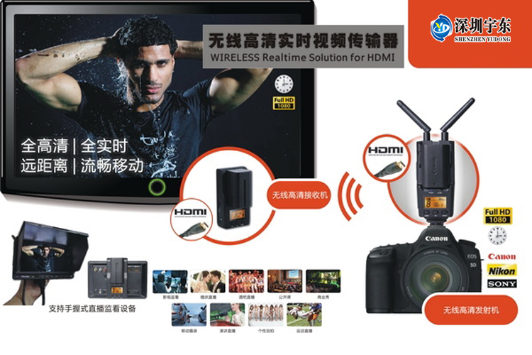 100米HDMI無線高清視頻傳輸器 HDMI 100米無線傳輸器 拍電影專用 適用攝像機(jī)、照相機(jī)等帶有HDMI輸出的便攜高清視頻設(shè)備; -支持DC供電(電源適配器12V、寬電壓范圍的應(yīng)急電源(6V~17V)或安裝鋰電池 (SONY NP-F570/F750/Canon LP-E6+及兼容系列電池)供電,內(nèi)部有防止電源范姐的保護(hù)設(shè)計(jì); -正面結(jié)構(gòu)為鋰電池卡座,用來安裝SONY。 隨著高清影視設(shè)備越來越廣泛的應(yīng)用,其布線過程中也出現(xiàn)了多方面的問題,如線材成本較高,使用壽命短,如果現(xiàn)場保護(hù)不夠,路過人群的踩踏可能影響線材表現(xiàn),甚至引發(fā)直播事故。本方案為影視直播場景提供了更加便捷安全的解決方案,其遠(yuǎn)距離傳輸多頻點(diǎn)支持配合大容量鋰電池系統(tǒng),即插即用設(shè)置,能充分的滿足各種室內(nèi)外拍攝需求,尤其是免布線的特點(diǎn),將帶給您更安全,更便利的專業(yè)體驗(yàn)。