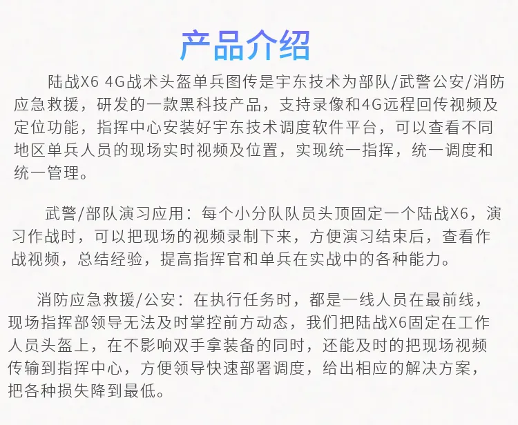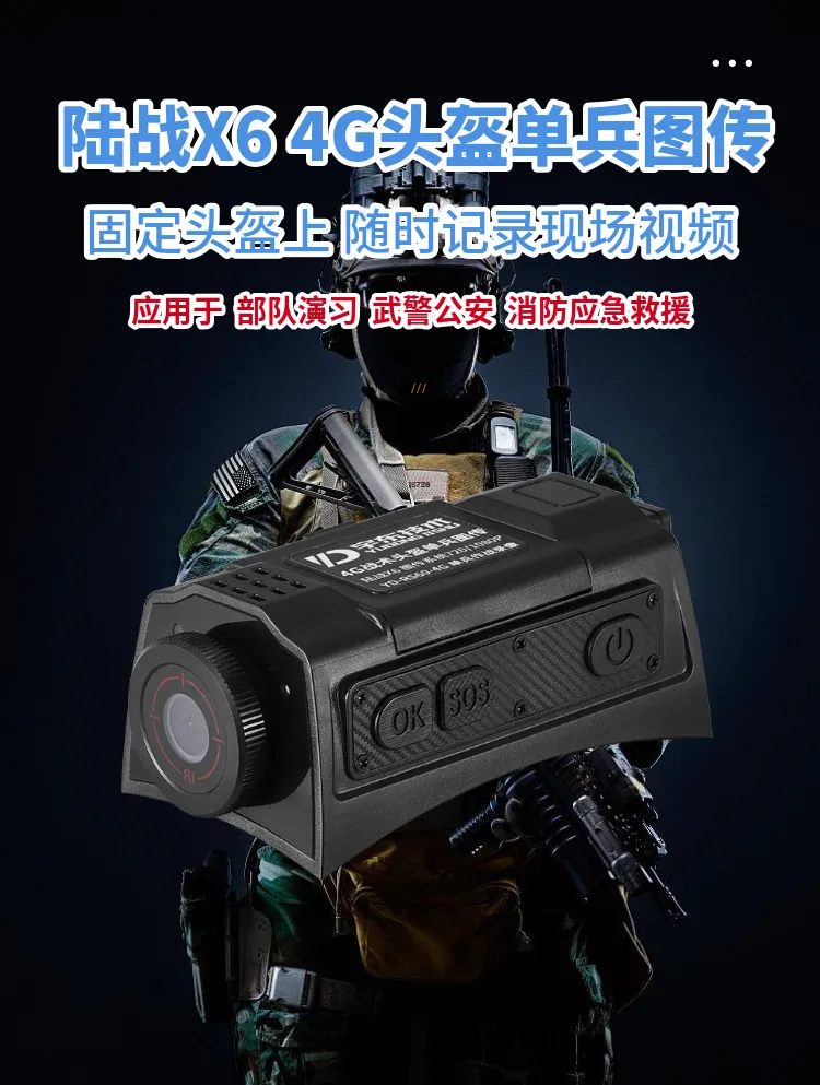 陸戰(zhàn)X6 4G戰(zhàn)術(shù)頭盔單兵無線圖傳是針對武警,特警,移動(dòng)執(zhí)法取證、行政監(jiān)管等單人便攜式監(jiān)控需求應(yīng)用場景開發(fā)的專用設(shè)備,該產(chǎn)品采用高速處理器和嵌入式Linux操作系統(tǒng),集超低照度彩色攝像機(jī)、音頻、4G和Wi-Fi無線通訊模塊、北斗、存儲(chǔ)、報(bào)警等模塊,配置高清夜視攝像頭及無線藍(lán)牙耳機(jī)。設(shè)備可通過4G、Wi-Fi無線網(wǎng)絡(luò)進(jìn)行實(shí)時(shí)視音頻信息傳輸、語音對講等功能;協(xié)同后端功能完善的監(jiān)控調(diào)度指揮平臺(tái)系統(tǒng)實(shí)現(xiàn)針對戶外移動(dòng)式個(gè)體的遠(yuǎn)程調(diào)度指揮功能。